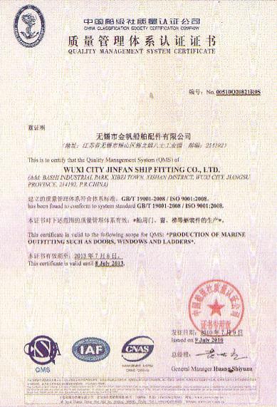 無錫市金帆船舶配件有限公司位于太湖之濱,風景秀麗的旅游勝地--無錫市錫山區錫港路和友誼路的交匯處,交通極為便利。 公司主要生產艦船用梯(鋁質便攜梯、舷梯等)、門(電磁屏蔽門、防火門、水密門、氣密門等)、窗(電磁屏蔽窗、舷窗等)、蓋(人孔蓋、艙口蓋等)及船用家具(客艙豪華金屬坐椅等)系列產品...